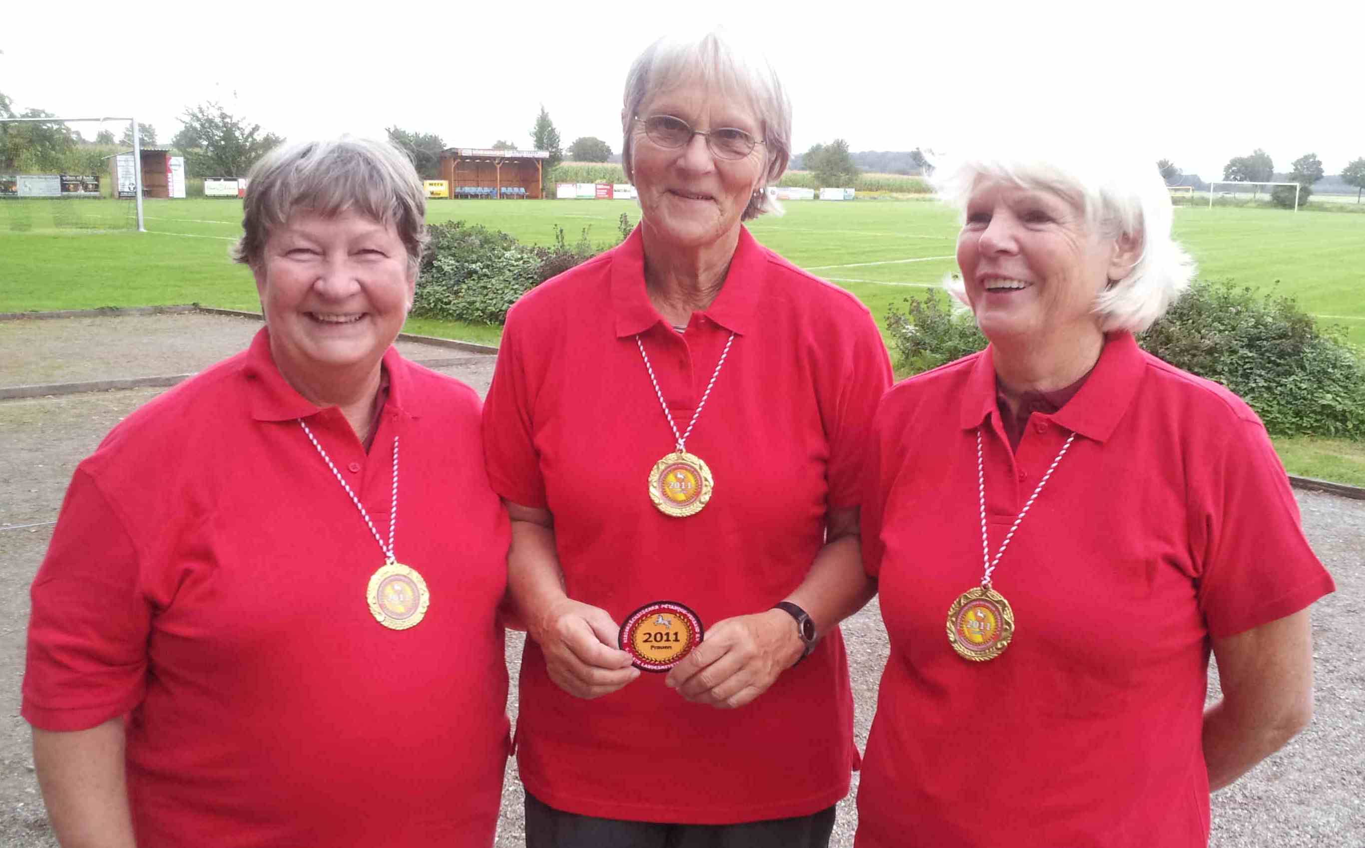 Das Team 6, dass mit Martina Janik/Bärbel Berganski/Anabela Weingärtner zum NPV-Frauenkader gehört, geht schnell in Führung mit 7 Punkten. Doch das Team 7 (siehe Bild) gibt nicht auf, bleibt ruhig und kämpft sich an die sieben Punkte des Gegners heran. Beim Stande von 9:7 für Team 7 gelingt Usch Schröder ein spektakulärer Schuss auf eine gut versteckte gegnerische Kugel und erzielt damit 3 Punkte. Es steht damit 12:7. Team 6 erholt sich nicht mehr von diesem Schlag und verliert dann schließlich mit 13:7.