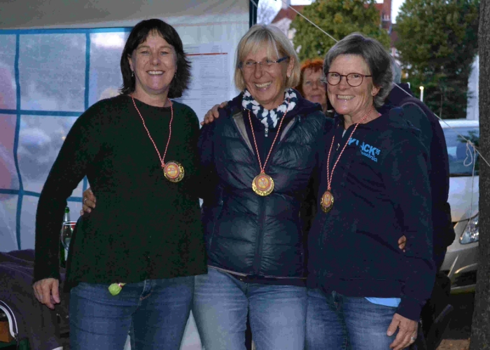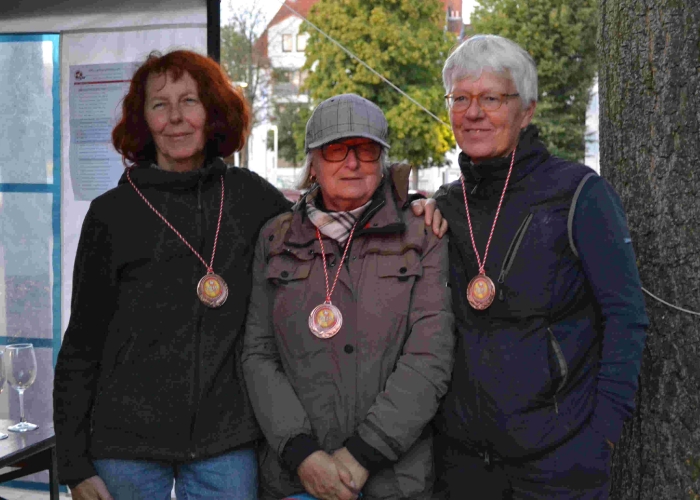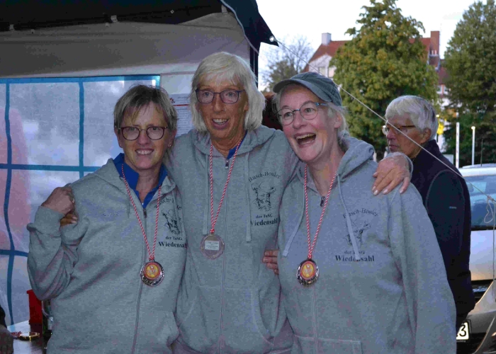 Landesmeisterteam der Frauen: Ute Laugallies (Klack 95 Osnabrück), Petra Hellmann (SGF Bremen), Iris Riepenhausen (Klack 95 Osnabrück) (von links) Vizemeisterteam: Barbara Sölter (TuSG Wiedensahl), Ursula Weiss (TuSG Wiedensahl), Renate Schwarzbauer (TuSG Wiedensahl) (von links) Dritter Platz: Marion Schwarz (TuRa Bremen), Renate Petschko (SGF Bremen), Angelika Horn (SGF Bremen) (von links) Die Ergebnisse der Landesmeisterschaft.