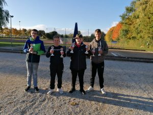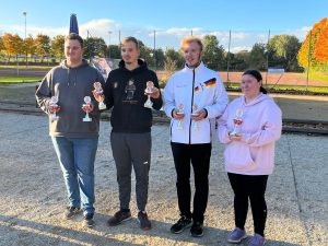 Hier konnte sich Daniel Rathe vom TSV Krähenwinkel-Kaltenweide e.V., gegen Noah Meyer von Wilde-Boule, Pétanque Club Wildeshausen e.V., in einem spannenden Finalspiel durchsetzen. Als 3. Platzierte standen dann Pascal Neu vom FC Schüttorf 09 und Katharina Ferenz vom TSV Rethen e. V. mit auf dem Treppchen.