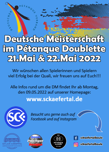 Die Deutsche Meisterschaft im Pétatanque Doublette findet am 21. und 22.Mai in Mannheim statt.