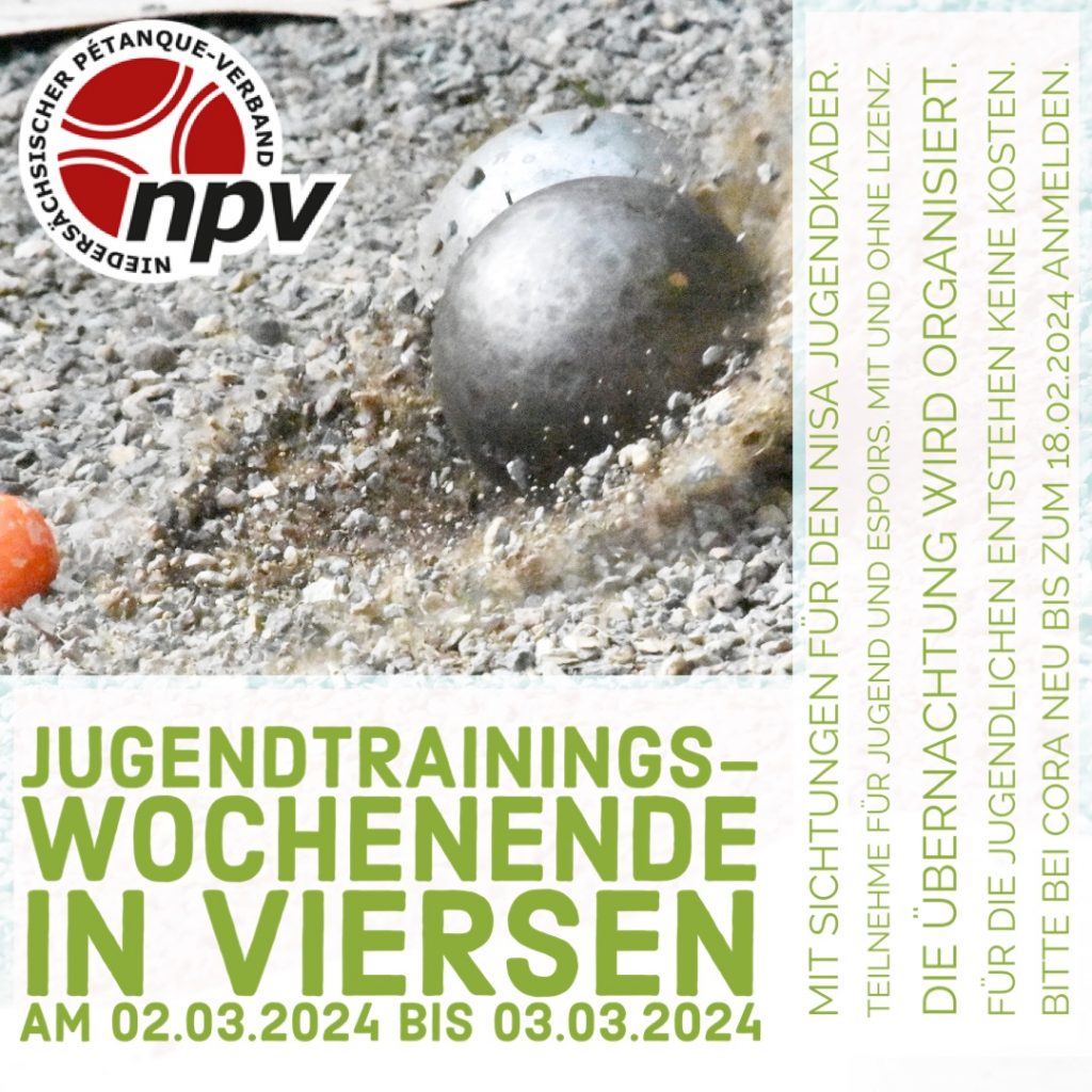 Vom 2. bis 3. März 2024 findet in Viersen ein Jugendtrainingswochenende statt. Anmeldungen bitte bis zum 18.02. an unsere Jugendwartin Cora Neu (jugend@petanque-npv.de).