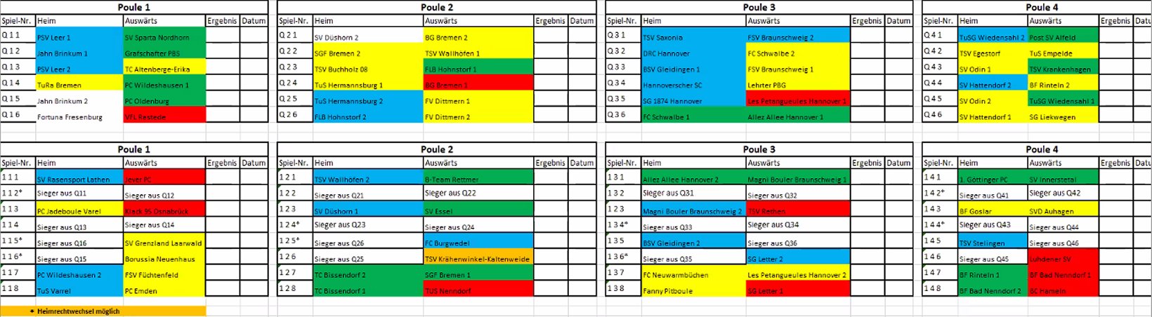 In exakt vier gleichmäßig aufgeteilten Poules kann rein theoretisch mit den ersten Partien begonnen werden. Eine Terminvorgabe für den Start der Qualifikation gibt es nicht. Die Qualifikation muss bis zum 01.05. beendet sein. Die Paarungen für die Hauptrunde 1 können ebenfalls schon beginnen, wenn Paarungen nicht auf einen Gegner aus der Qualifikation warten müssen. Die erste Hauptrunde muss bis zum 26.05. abgeschlossen sein.