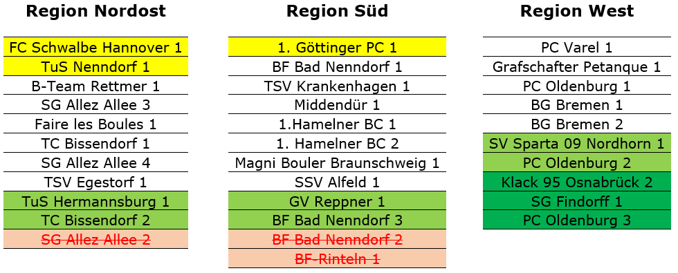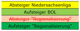 Da nun die Regionalligen nicht mit der passenden Anzahl Teams bestückt sind, greifen die Übergangsregelungen der Regionalisierung zum Jahr 2023: „Sind in der Summe dann mehr als 10 Teams in einer RL Staffel, steigen so viele Mannschaften gemäß ihrem erreichten Tabellenplatz ab, bis die Anzahl der verbleibenden Mannschaften zehn beträgt. Wenn notwendig, wird auch hier ein Quervergleich gezogen.“ Damit steigen SG Allez Allee 2, BF Bad Nenndorf 2 und BF Rinteln 1 ab, obwohl sie in den Abschlusstabellen 2022 nicht auf einem Abstiegsplatz standen.