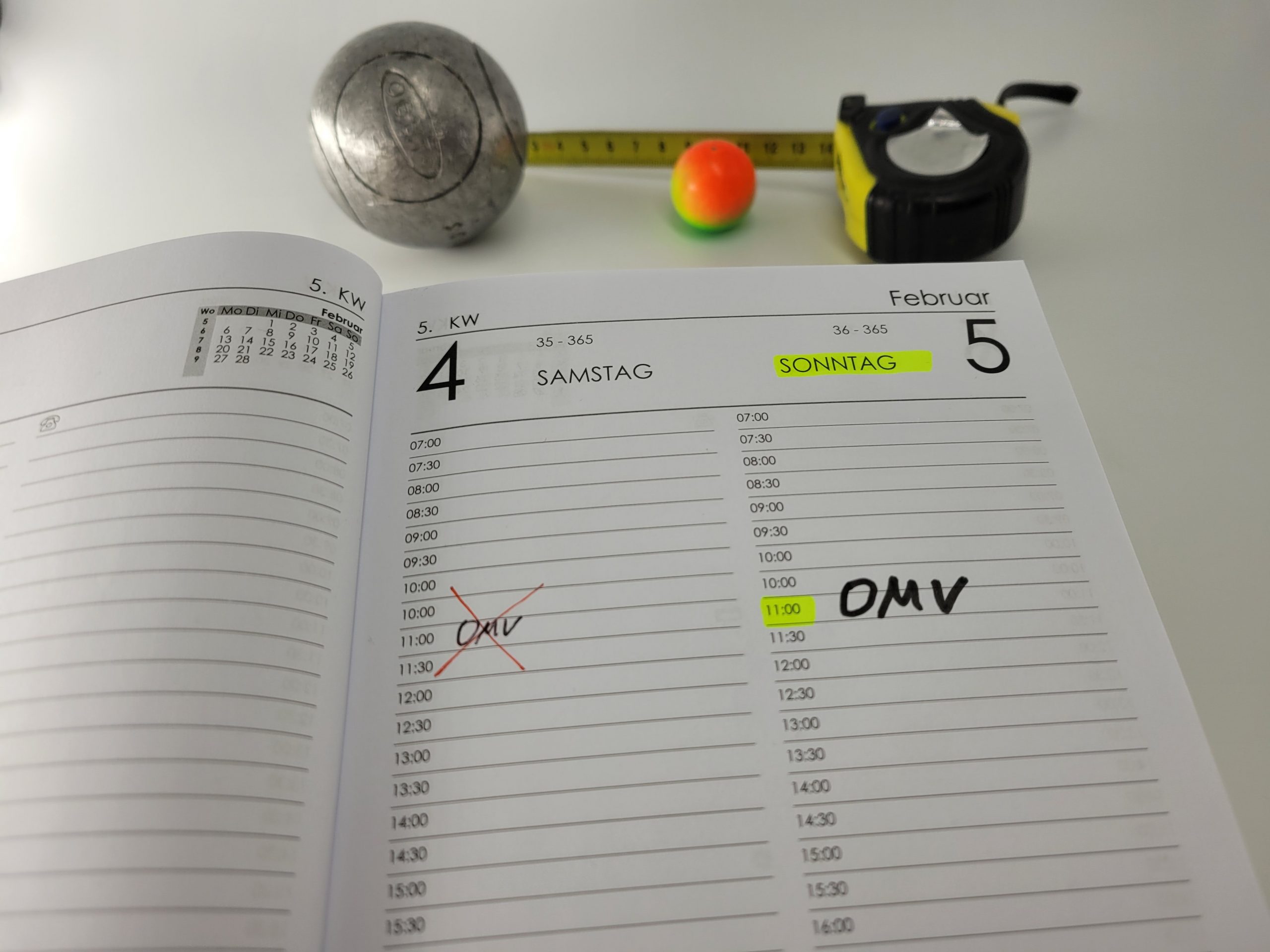 Die kommende Ordentliche Mitgliederversammlung des Niedersächsischen Pétanque-Verbandes e.V. wird vom Samstag (04.02.2023) auf Sonntag (05.02.2023) verschoben, da die Räumlichkeiten beim LSB in Hannover erst am Sonntag zur Verfügung stehen.